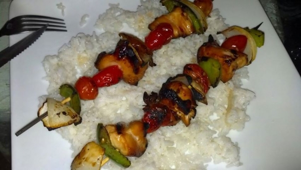 When chopping the bell pepper, aim for the same size as the medium size pieces of onion. I usually put the small and largest sizes of the onion quarters in my teriyaki sauce. Skewer a mushroom, a green pepper piece, an onion slice, a piece of chicken, then a cherry tomato. Repeat... grill. Serve over rice and pour more teriyaki sauce on top. Yummy.